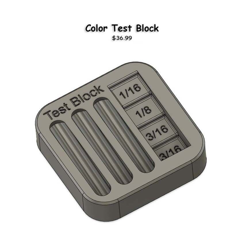Test Block has 3 slopping compartments to see if you have have the correct color density and 4 steps downs to help too. Dimensions: 2 x 2 x .5 inches